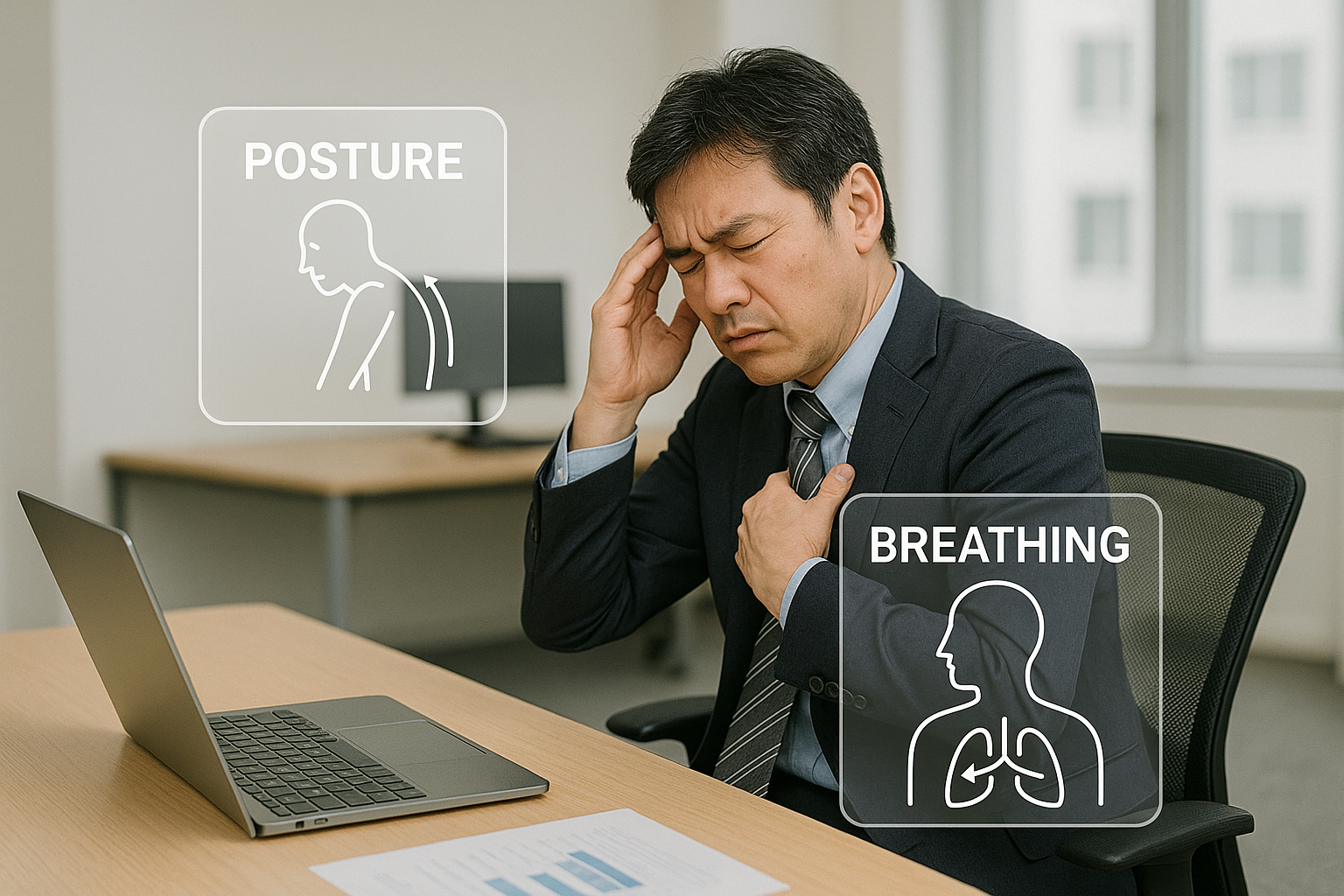 デスクワークで肩こりによる頭痛(緊張性頭痛)に悩まされている方のほとんどが、「姿勢」と「呼吸」の崩れが原因です。