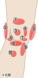 ※ 上記の図では ⑨鵞足炎 ②腸脛靭帯炎(ランナー膝)
