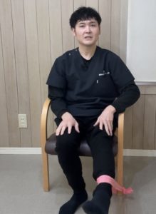 このようにゴムバンドを椅子に固定し、膝を曲げるように鍛えます。